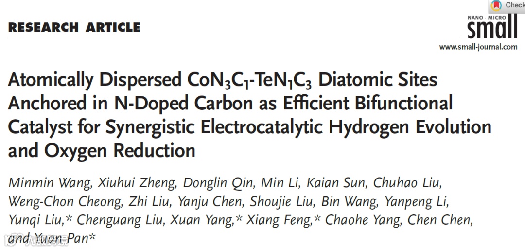 基于此,来自中国石油大学(华东)潘原副教授等人,在国际知名期刊Small上发表题为“Atomically Dispersed CoN3C1-TeN1C3 Diatomic Sites Anchored in N-Doped Carbon as Efficient Bifunctional Catalyst for Synergistic Electrocatalytic Hydrogen Evolution and Oxygen Reduction”的研究文章。