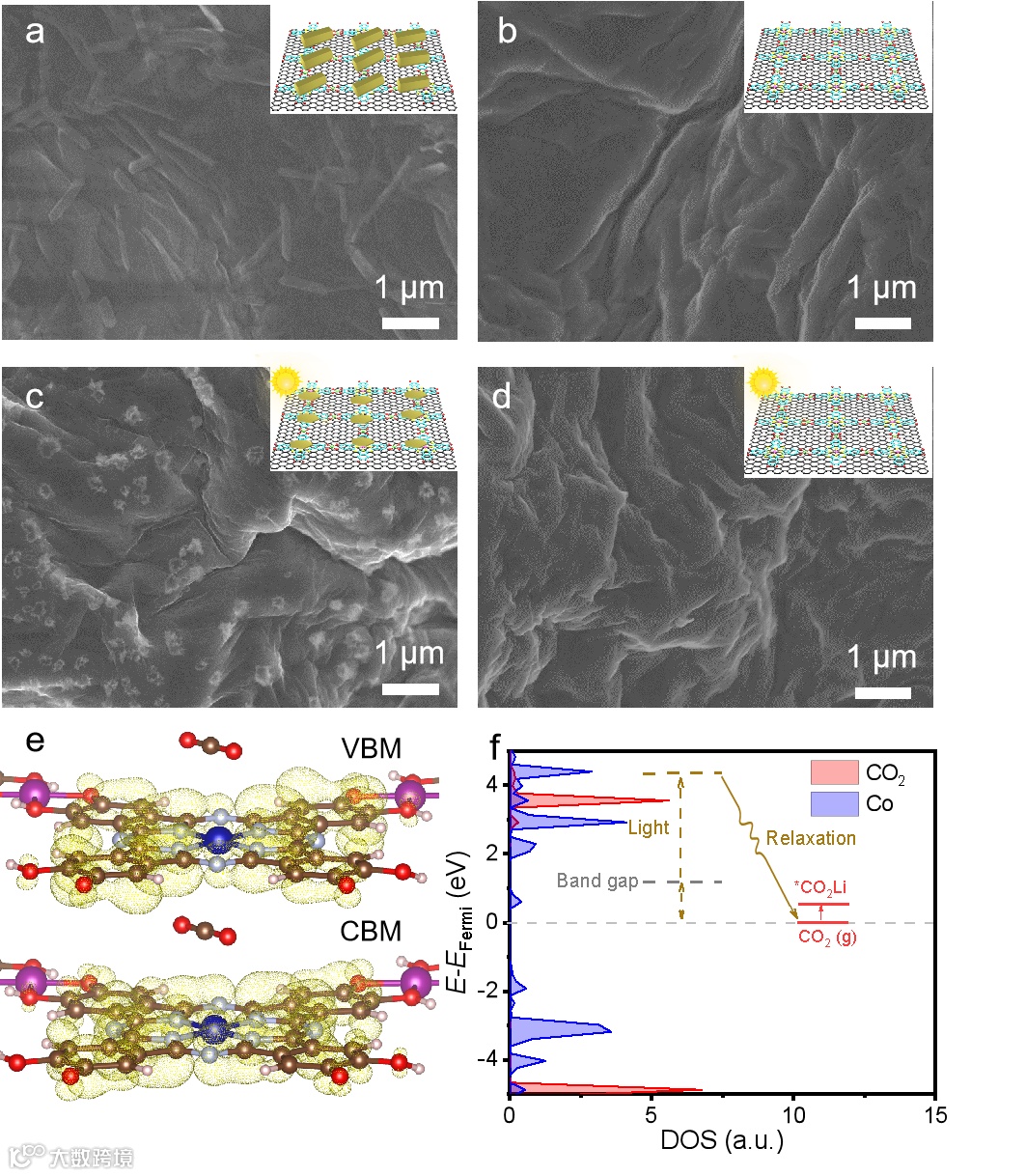 该工作通过DFT理论计算研究了在有无光存在的条件下CRR过程中的CO2活化能力的影响。在无光照条件下,CoPc-Mn-O的能带勉强满足CO2的活化能垒,这就导致了无光照条件下电池性质较差。而在光照条件下,光能有可能将CoPc-Mn-O能带进一步的进行激发,在驰豫过程中能够给材料提供3.2 eV的额外能量,使得CO2的活化更容易进行,从而有利于CRR过程(图4)。