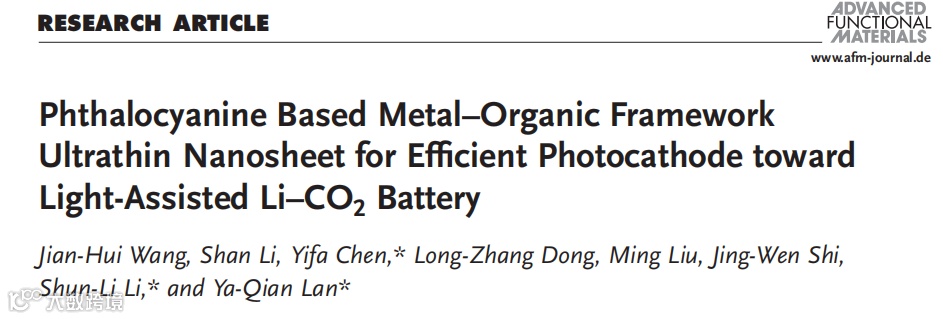 基于此,来自华南师范大学的陈宜法教授、兰亚乾教授、李顺利教授,在国际知名期刊Advanced Functional Materials上发表题为“Phthalocyanine based Metal-Organic Framework Ultrathin Nanosheet for Efficient Photocathode toward Light-assisted Li-CO2 Battery”的观点文章。该观点文章研究合成了一种具有Co-N4和Mn-O4双功能位点的酞菁MOF纳米片并成功将其应用于高效光辅助Li-CO2电池,为基于多孔晶态材料的新型阴极催化剂的设计合成提供了参考(图1)。