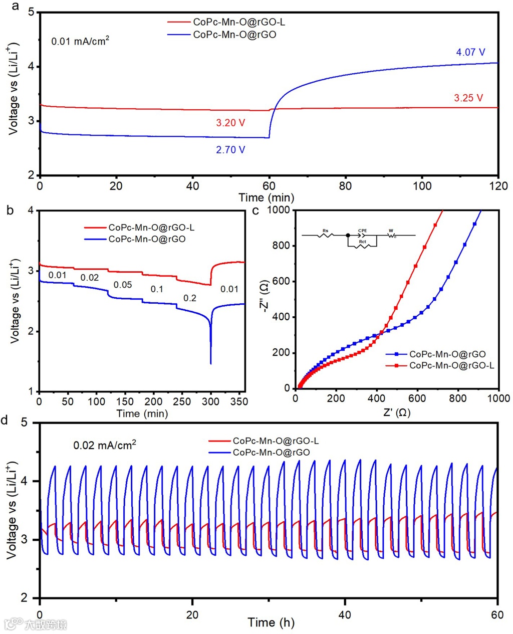 CoPc-Mn-O@GO催化的光辅助Li-CO2电池具有超低过电位(0.05 V)。即使在较高的电流密度下,CoPc-Mn-O@rGO-L基电池仍然保持了良好的循环稳定性,在0.02 mA/cm2的电流下,循环60小时后过电位仍然很小(图3)。