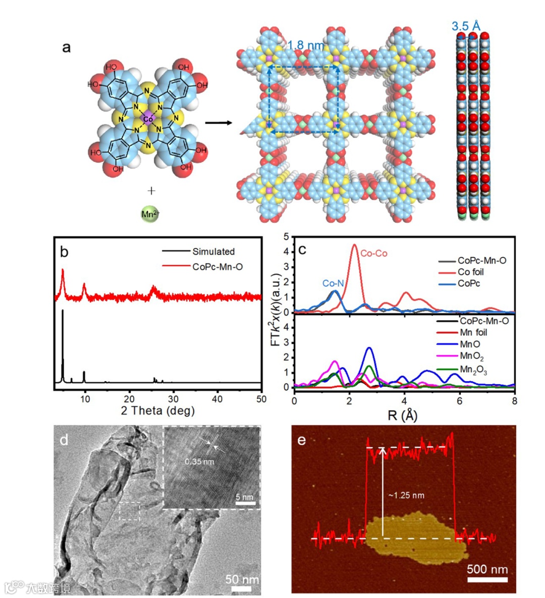该工作开发了一种双功能酞菁MOF纳米片(CoPc-Mn-O)并成功将其应用于高效光辅助Li-CO2电池阴极催化剂(图2)。该工作中具有Co-N4基团的酞菁分子与Mn-O4基团(有利于碳酸锂分解)自组装形成的具有明确结构的MOF材料将解决这些问题: