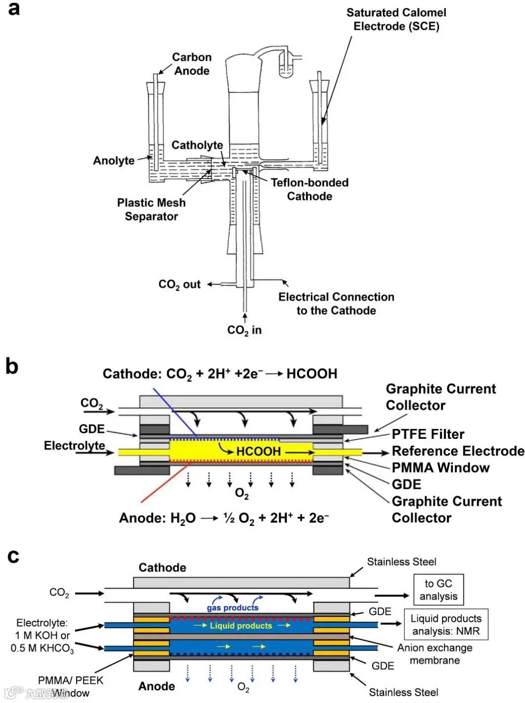 液态阴极电解液的使用是造成水淹现象的主要元凶,此外这一电解液层的存在也显著增大了电解池的电阻,提高了反应所需的电压,导致能量效率较低。相比之下,膜电极电解池中舍弃了液态阴极电解液的使用,GDE直接与离子交换膜接触,同时解决了以上问题。而微液流电解池由于其液态电解液层允许了参比电极的使用,能够准确控制阴极电势,因此更适合被应用于CO2/CO电化学还原的基础研究中。