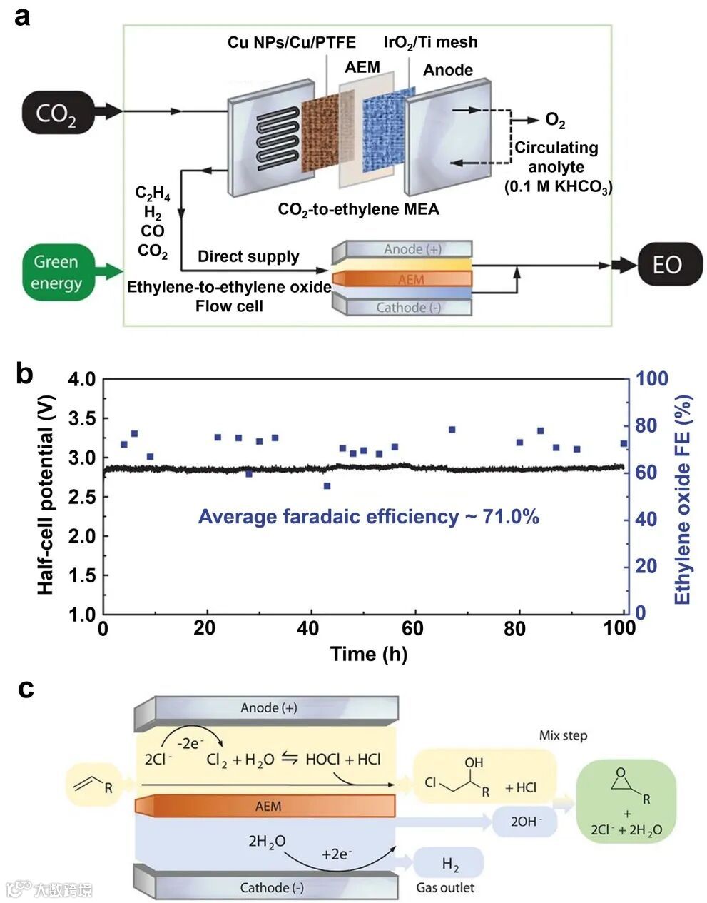 图4. (a)集成的电化学CO2制环氧乙烷系统示意图。A-MEA构型的CO2电解池出口气中富含乙烯,被直接输送至第二个微液流电解池转化得到环氧乙烷。(b)300 mA/cm-2恒定电流密度下乙烯氧化制环氧乙烷的稳定性测试曲线。(c)乙烯氧化制环氧乙烷的流程示意图。