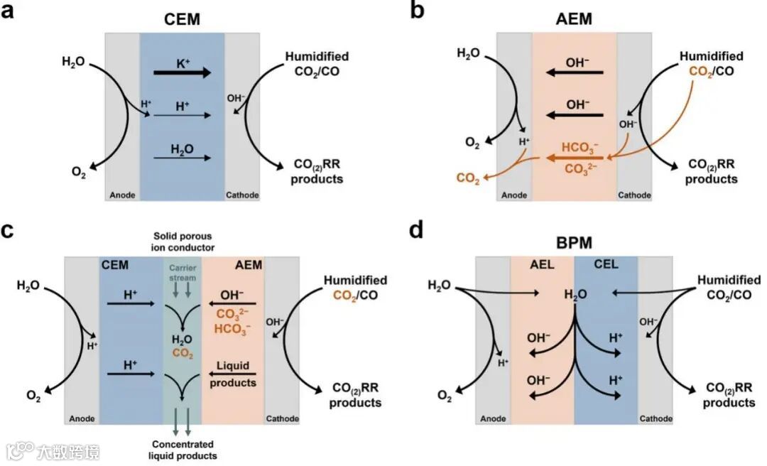 图3. 膜电极电解池的4种主要构型: (a) 阳离子交换膜型;(b) 阴离子交换膜型;(c) 阴离子交换膜-固态电解质-阳离子交换膜型;(d) 双极膜型