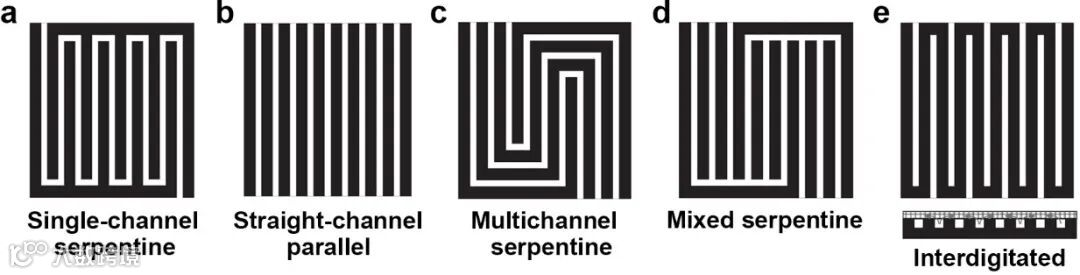 图6. 大型流动电解池中5种典型的流道构型. (a) 单通道蛇形;(b) 直通道平行;(c) 多通道蛇形;(d) 混合蛇形;(e) 交叉指形