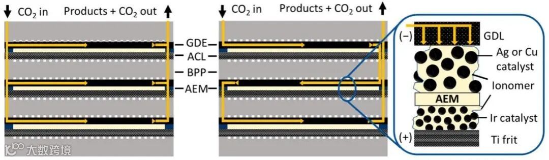 图1. CO2/CO电化学还原中两种主要的流动电解池构型