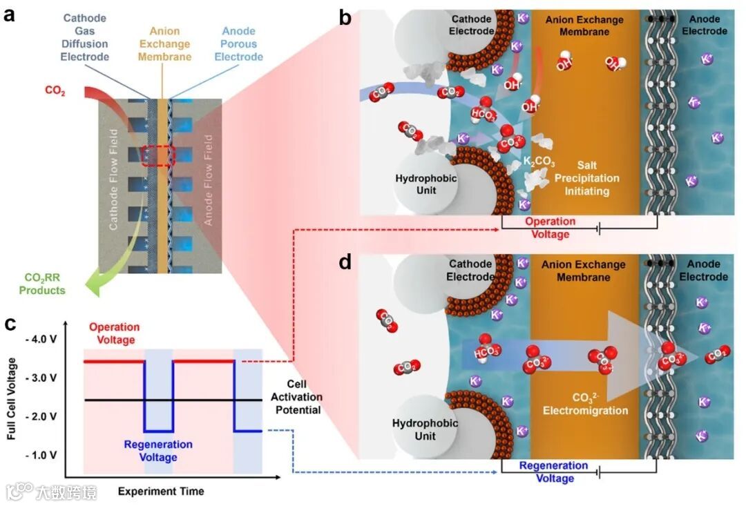 图5. 以A-MEA型膜电极电解池(a)为例,(b) CO2电解过程中碳酸盐形成及结晶的过程示意图。施加方波电位(c)后,在再生电位下,(d)CO2电解停止,碳酸根离子电迁移至阳极,碳酸盐积累的问题得到抑制。