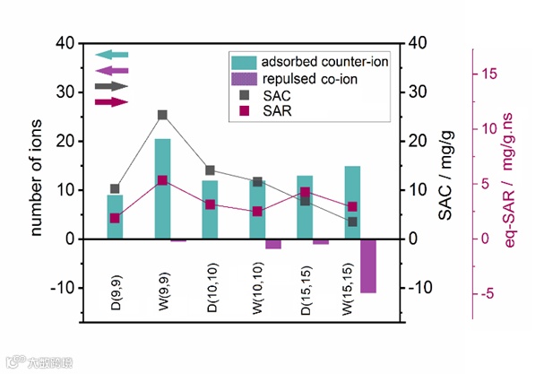 继续计算了不同孔径和亲疏水性的CNT电极CDI系统的盐吸附容量(SAC)和盐吸附率(SAR),以比较不同CNT电极的脱盐效率(图2)。结果显示CNT-CDI系统的脱盐效果受到电极孔径和亲疏水性的共同影响,其中W(9,9)具有最高的SAC和SAR。由于电解质被截留在封闭的CNT孔隙中,所以其迁移受到了更多的限制。然而由于电极孔内的离子和带电的壁面内共同对CNT内的水分子结构的扰动,反离子进入纳米孔的电阻率有所降低。