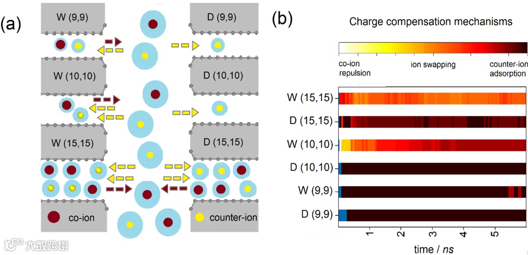 图1 (a) CNT-CDI系统的反离子吸附、同离子排斥和离子交换的不同电荷补偿机制;(b)在6 ns充电时间内CNT-CDI系统的电荷补偿机制。(蓝色表示孔隙和储层之间的离子交换尚未开始)