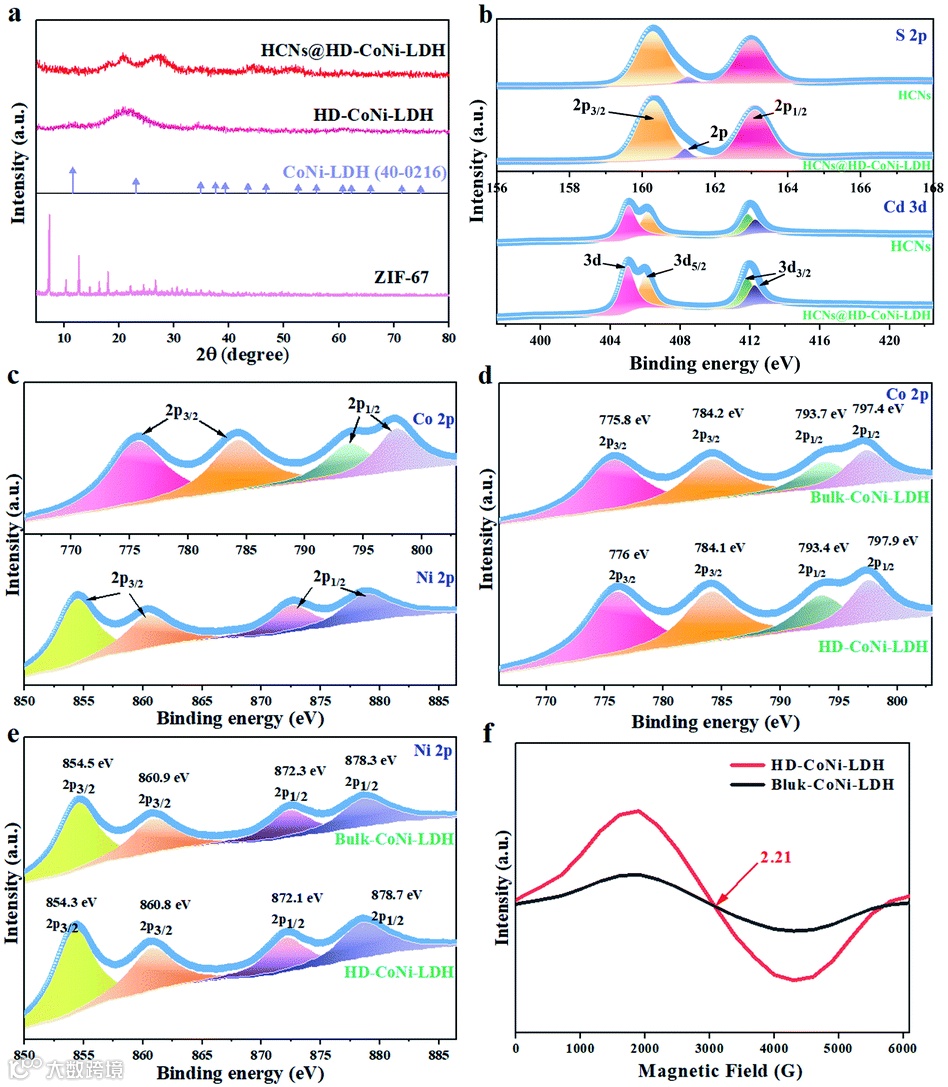 图3 (a) ZIF-67、HD-CoNi-LDH和HCNs@HD-CoNi-LDH的XRD图谱。(b) HCNs 和 HCNs@HD-NiCo-LDH 的 Cd 3d 和 S 2p XPS 光谱。(c) HCNs@HD-NiCo-LDH 的 Co 2p 和 Ni 2p 的 XPS 光谱。(d) HC-CoNi-LDH 和块状-CoNi-LDH 的 Ni 2p 和 (e) Co 2p 的 XPS 光谱。(f) HC-CoNi-LDH 和块状-CoNi-LDH 的 EPR 光谱。