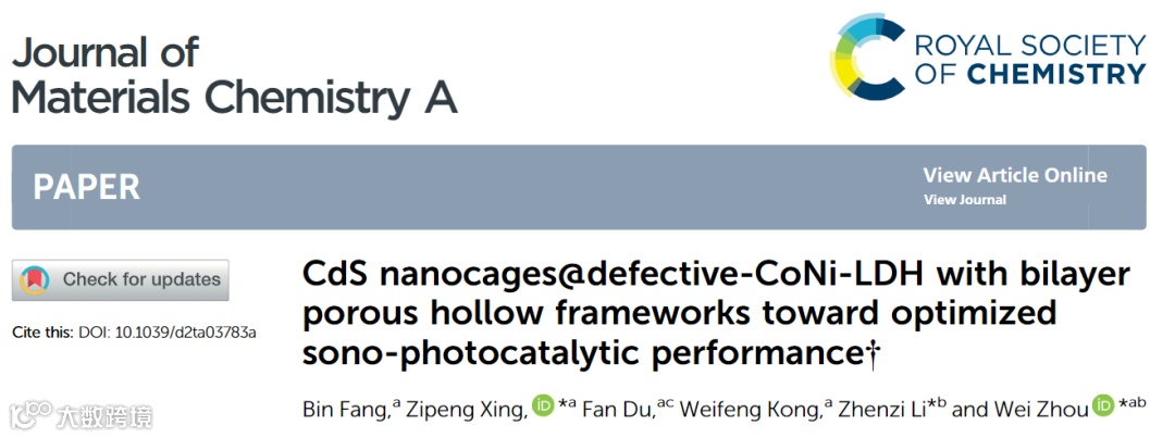 基于此,黑龙江大学邢子鹏教授与齐鲁工业大学周卫教授合作,在国际知名期刊Journal of Materials Chemistry A上发表题为“CdS nanocages@defective-CoNi-LDH with bilayer porous hollow frameworks toward optimized sono-photocatalytic performance”的研究性文章,该文章通过两种可控的硫化法合成了CdS纳米立方体,比较了不同空心度下观察到的声-光催化性能,然后利用MOF模板,通过与金属盐的反应蚀刻出具有可控缺陷的复杂空心多孔LDH纳米笼。