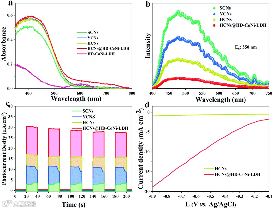 图5 (a) 紫外-可见漫反射光谱。(b)稳态光致发光光谱,(c)可见光照射下的光电流响应和(d)HCNs和HCNs@HD-CoNi-LDH的I-V曲线。