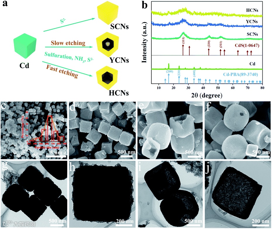 图 1 (a) 制备过程示意图,(b) XRD图案,(c-f) SEM和 (g-j) Cd-PBA、SCNs、YCNs 和 HCNs 的TEM 图像((c的插图))显示了Cd-PBA纳米立方体的粒度分布曲线)