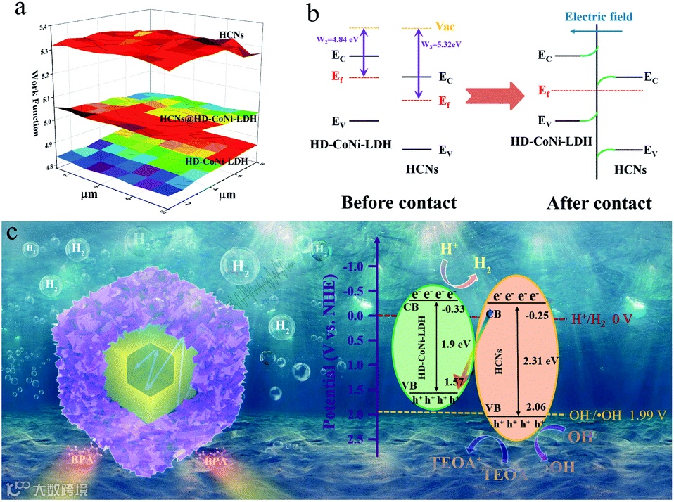 图6(a)所制备样品的SKP图。(b)HCNs和HD-CoNi-LDH接触前的功函数,接触后HCNs@HD-CoNi-LDH界面的能带边缘弯曲示意图。(c)可见光照射下HCNs@HD-CoNi-LDH双层空心骨架异质结构中光反射、光催化析氢和降解污染物的光催化机理示意图。