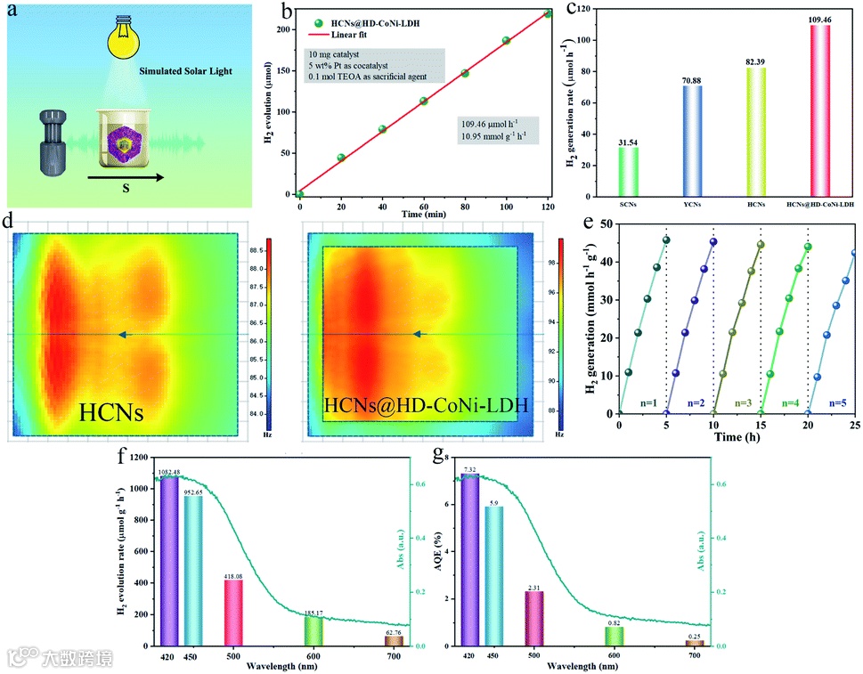 图4 (a) 超声波声光催化装置示意图。(b) HCNs@HD-CoNi-LDH在可见光照射下随时间的声光催化析氢。(c) 制备的 SCNs、YCNs、HCNs 和 HCNs@HD-CoNi-LDH 复合材料的声光催化产氢速率。(d) HCNs和HCNs@HD-CoNi-LDH的模拟声场示意图。(e) HCNs@HD-CoNi-LDH在连续5个循环中的H2产率。(f) 在单色光照射下的氢生成速率和 (g) 相应的 AQE。