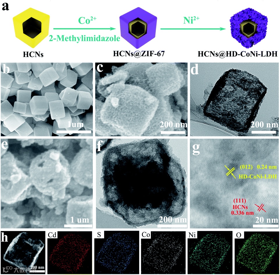 图2 (a) HCNs@HD-CoNi-LDH的制备示意图。(b) ZIF-67 和 (c) HD-CoNi-LDH 的 SEM 图像。(d) HD-CoNi-LDH 的 TEM 图像。(e) HCNs@HD-CoNi-LDH 的 (e) SEM、(f) TEM、(g) HRTEM 和 (h) 元素映射 (Cd, S, Co, Ni, O)。