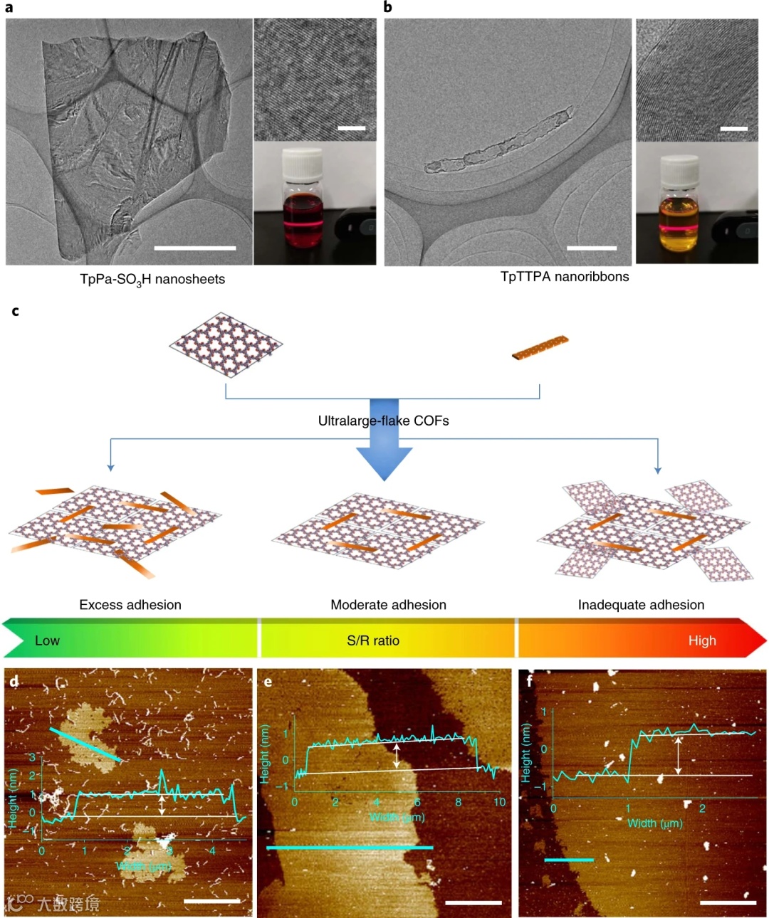 TpPa-SO3H纳米片具有典型的片状结构,横向尺寸约为1.5 μm;TpTTPA纳米带具有一维纳米带形貌,长度可达数微米,两类COF均具有清晰的晶格条纹,水分散液均表现出明显的丁达尔效应。将两类COF在水溶胶中共混可得超大COF纳米片,用于COF膜制备可消除膜内边界缺陷,形成稳定互锁结构。同时通过不同比例(纳米片:纳米带,S/R)的粘合,可出现三种粘合效果:过粘合,适粘合和欠粘合。
