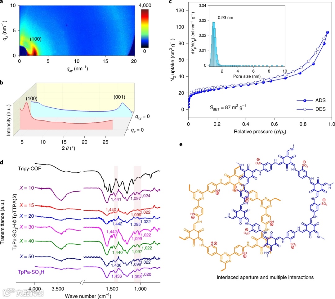其中,TpPa-SO3H@TpTTPA(20)膜具有优异的结晶度和一致的晶面取向,其一维孔道垂直于基膜,因此在膜内形成了贯通的传质通道。纳米片和纳米带间存在静电、范德华、π-π多重相互作用,驱动纳米片间错位堆积,产生遮蔽效应,膜孔尺寸可缩小至0.93 nm。