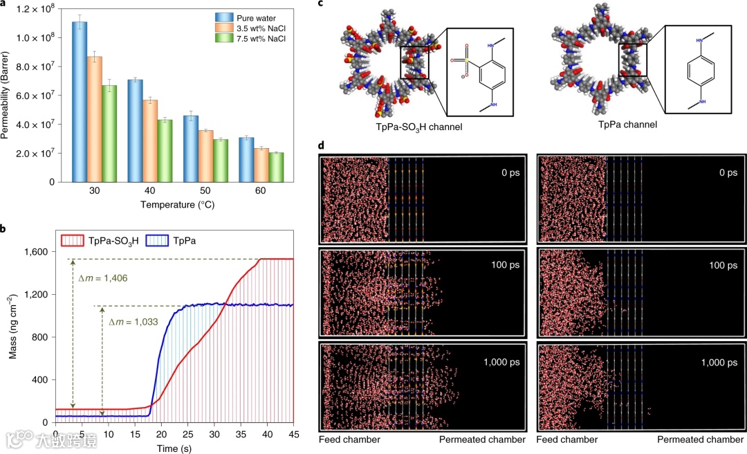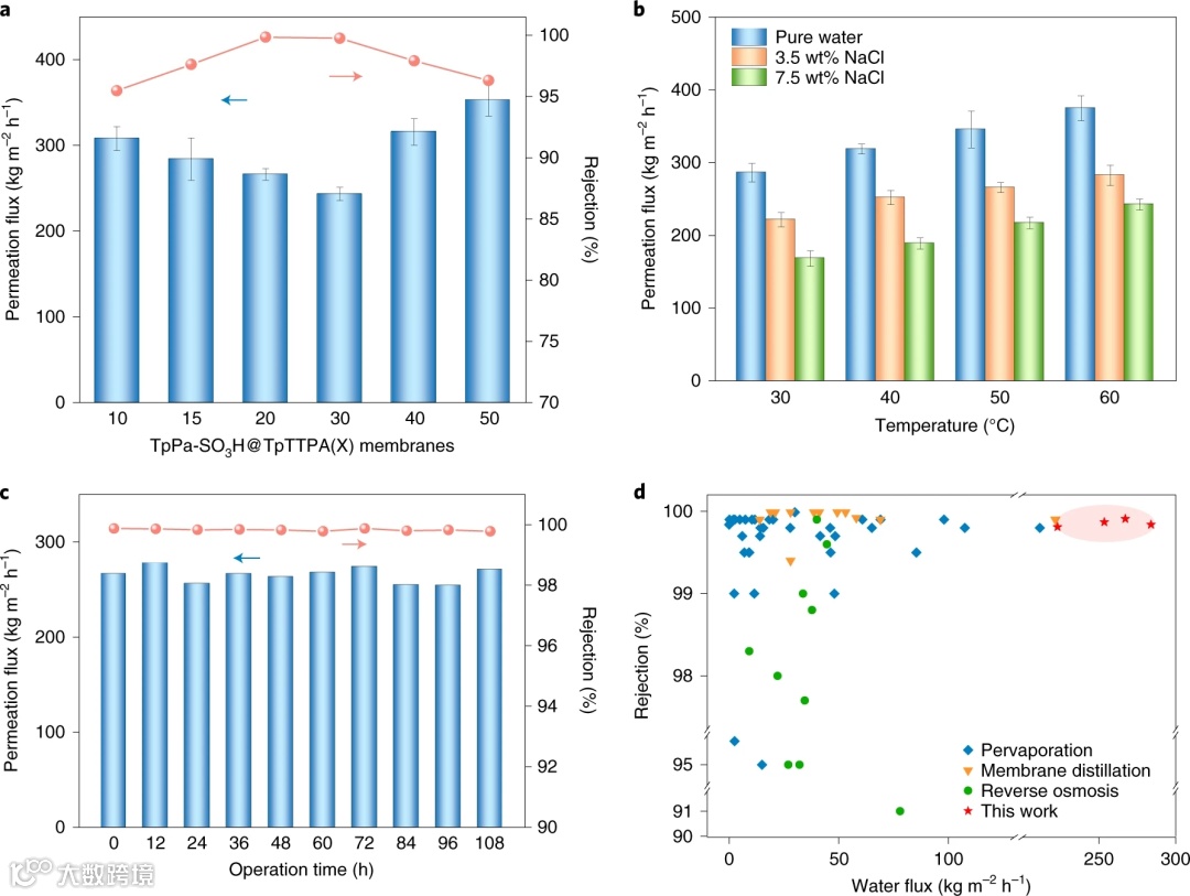 (2)制备的COF膜用于渗透蒸发脱盐,水通量可达267 kg m-2 h-1,约为传统高分子膜4-10倍,脱盐率达99.9%。