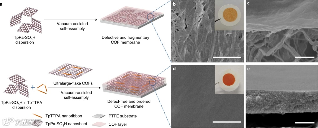 将预组装的超大COF纳米片通过真空辅助自组装沉积在基膜上,可得连续无缺陷、厚度适中的COF膜。但当TpPa-SO3H纳米片单独成膜时,膜表现出大量的缺陷和裸露的基膜表面。充分证明了仿生粘合策略在制备连续无缺陷COF膜中的关键作用。