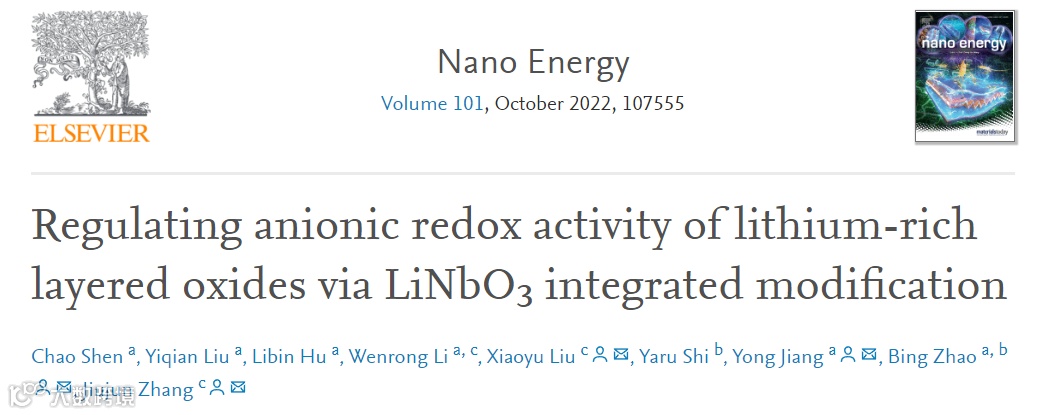 基于此,上海大学刘小瑜副教授、赵兵教授、蒋永教授与张久俊教授(加拿大皇家科学院院士)课题组,在国际知名期刊Nano Energy上发表题为“Regulating anionic redox activity of lithium-rich layered oxides via LiNbO3 integrated modification”的研究工作。