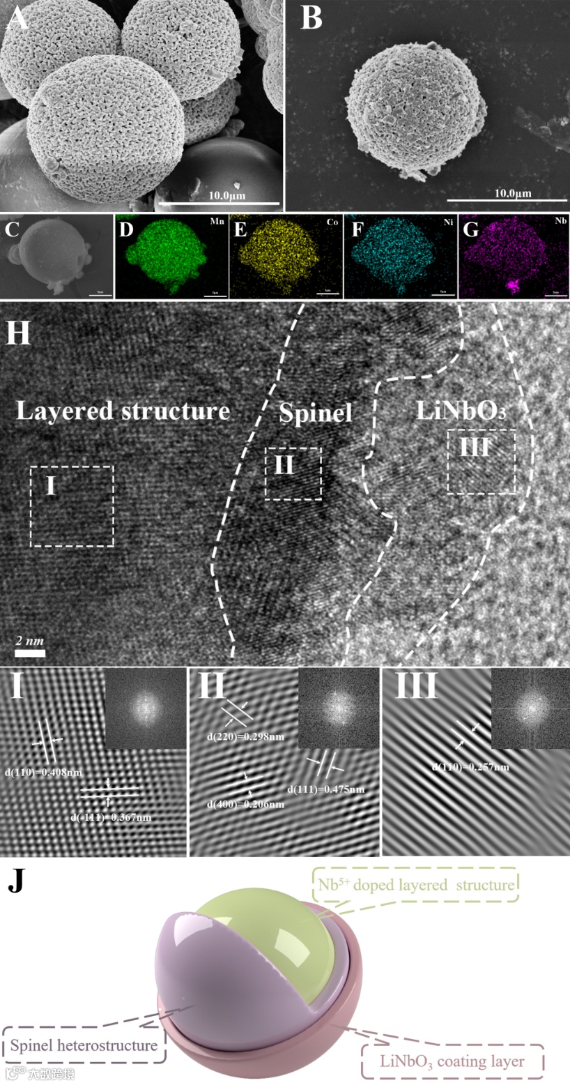 图2. (a) 未改性富锂锰基正极与 (b) LiNbO3一体化修饰的富锂锰基正极的扫描电镜图。(c-g) LiNbO3一体化修饰的富锂锰基正极的扫描电镜及相应的能谱图。(h) LiNbO3一体化修饰的富锂锰基正极的高分辨透射电镜图及不同区域的快速傅里叶转化 (FFT) 和反FFT图,分别用I, II, III进行标记。(j) LiNbO3一体化修饰的富锂锰基正极的结构示意图。