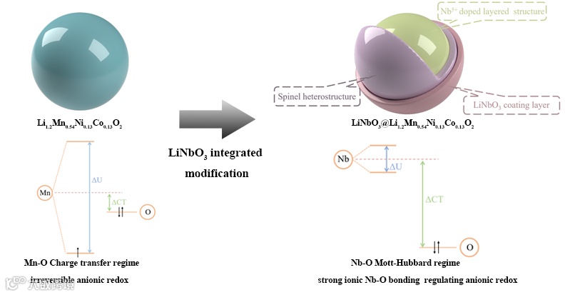 图1. LiNbO3一体化修饰调控富锂层状氧化物阴离子氧化还原可逆性的示意图。