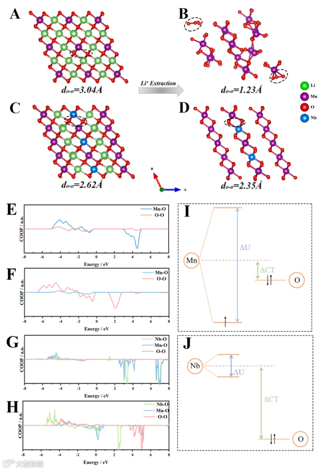 通过密度泛函理论及晶体轨道交叠步居 (COOP) 对完全脱锂后的Li2MnO3和Li2Nb0.25Mn0.75O3模型进行结构弛豫分析。结果显示Li2MnO3完全脱锂后,O-O键键长仅有1.23 Å,表明晶格氧易形成氧气分子逸出晶格,导致层状结构崩塌。而完全脱锂的Li2Nb0.25Mn0.75O3依然存在明显Nb-O配位,且COOP (O-O) 信号远低于未改性富锂锰基正极中COOP (O-O) 信号,表明Nb掺杂抑制富锂锰基正极材料晶格氧的过氧化,从而改善氧阴离子氧化还原的可逆性。