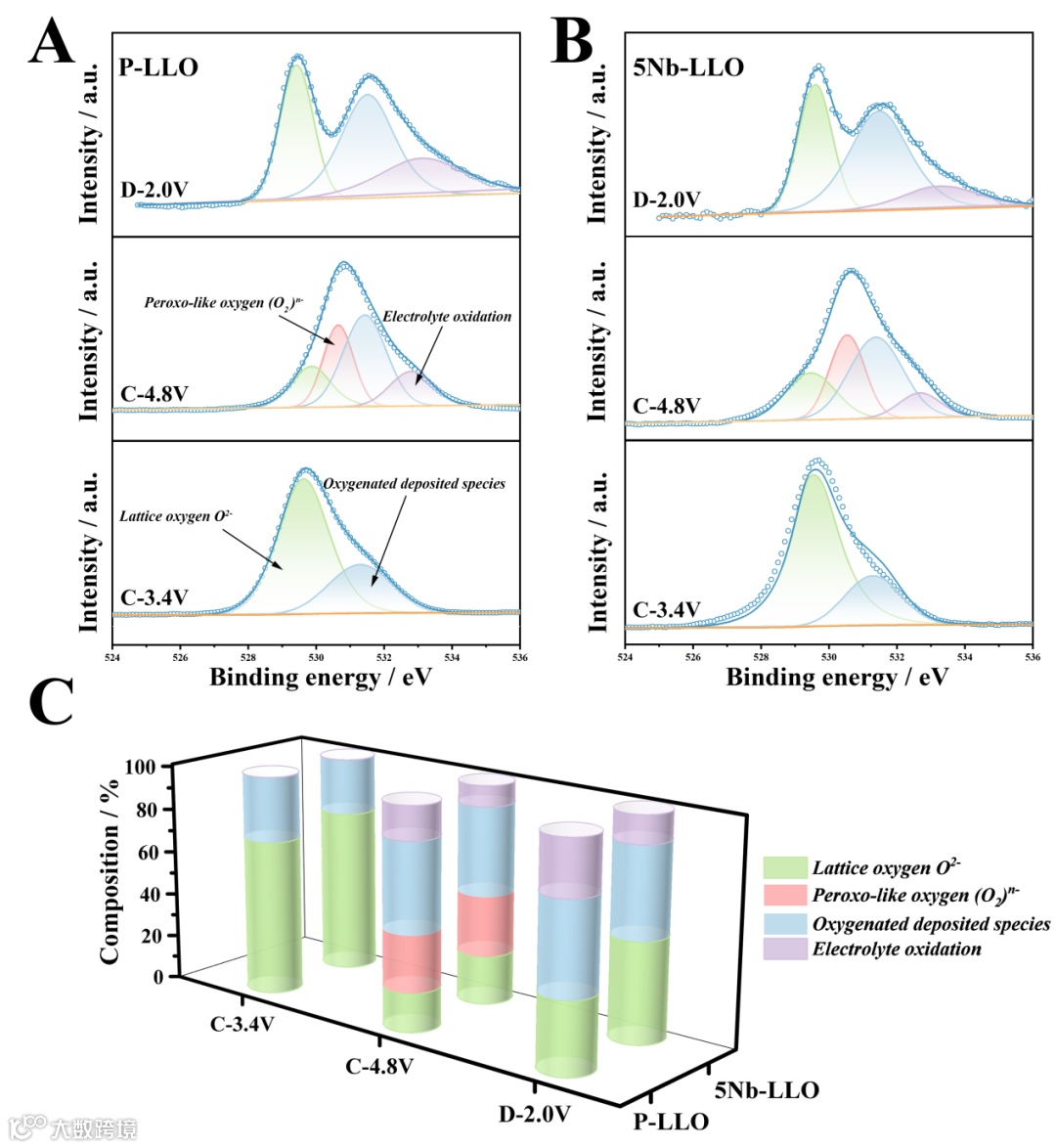 图4. 不同充放电态下(a) 未改性富锂锰基正极材料和 (b)LiNbO3一体化修饰的富锂锰基正极材料的XPS O 1s谱。(c) 未改性与LiNbO3改性后的富锂锰基正极在不同充放电态下不同含氧物质的百分比含量。