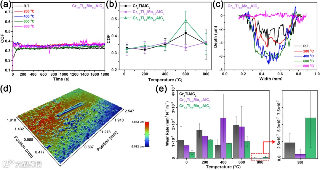 图2. Cr2-xTi1-xMo2xAlC2的高温摩擦性能表征