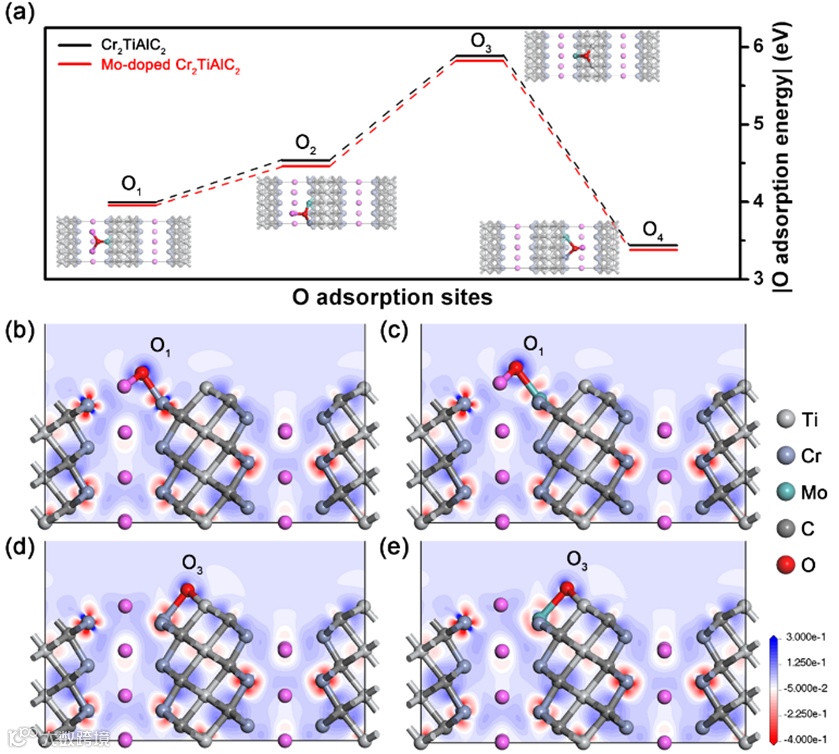 最后,基于密度泛函理论(DFT)进行了理论模拟(图5)。首先选取了四个可能的O原子吸附位点,计算了O原子在Cr2TiAlC2和Mo掺杂Cr2TiAlC2(010)表面的吸附能(Eads)。可以看到,O原子吸附于碳化物片层边缘位置时其Eads远高于吸附于层间位置,这表明MAX的氧化过程可能始于过渡金属碳化物片层边缘。因此,摩擦过程中形成的碳化物碎片将更快发生氧化。