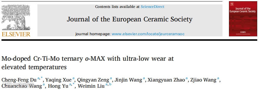 基于此,西北工业大学先进润滑与密封材料研究中心刘维民院士团队杜乘风副教授和余泓副教授,在国际知名期刊Journal of the European Ceramic Society 上发表了题为“Mo-doped Cr-Ti-Mo ternary o-MAX with ultra-low wear at elevated temperatures”的研究论文。
