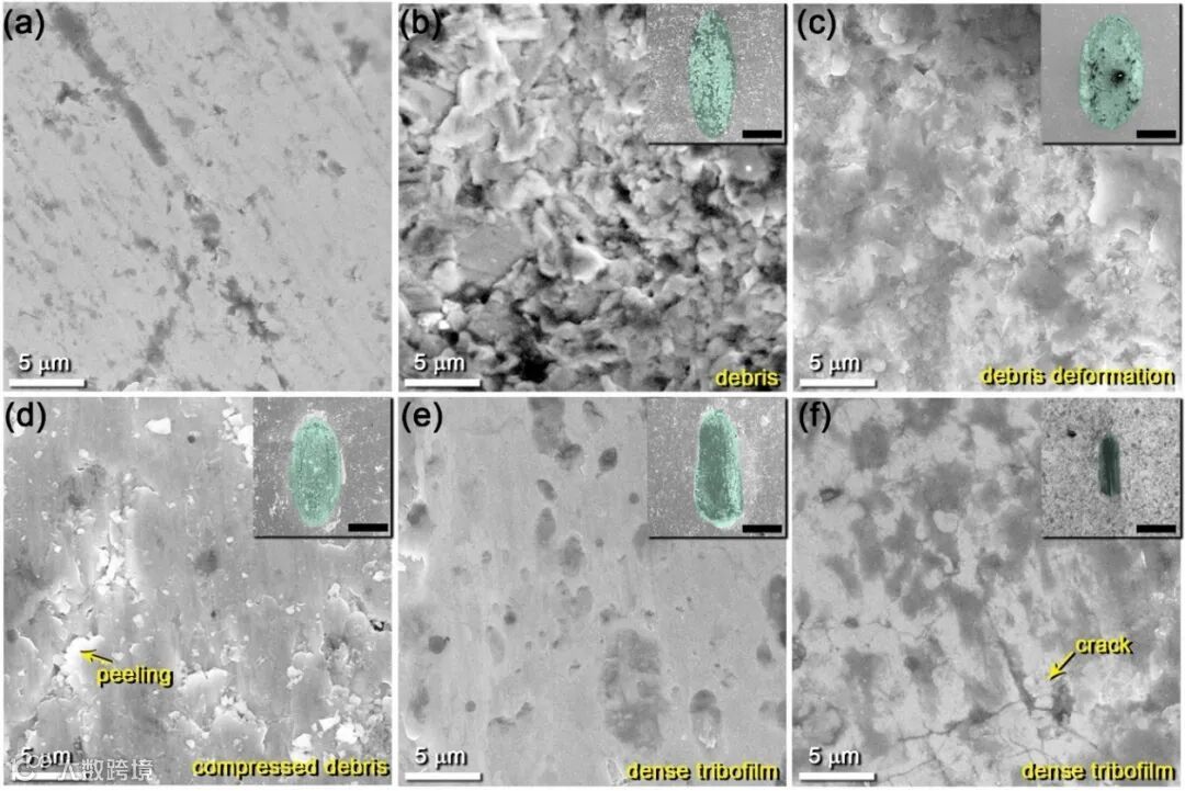 图3. Cr1.9Ti0.9Mo0.2AlC2原始表面(a)和不同温度下摩擦膜的形貌:(b)室温,(c) 200℃,(d) 400℃,(e) 600℃,(f) 800℃。