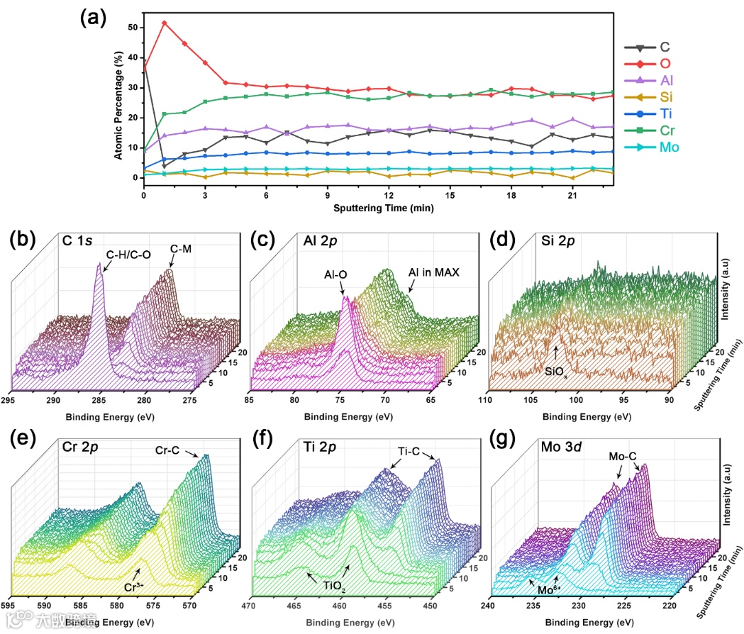X射线光电子能谱(XPS)深度剖析证实了具有梯度成分的摩擦膜结构,可以同时在高温下提供流体润滑和自愈合效果。通过理论模拟证实,Mo的掺杂可影响该MAX陶瓷的层间结合强度,并改变了Cr2TiAlC2基体的氧化行为。具有最佳的层间结合强度和氧化速率的Cr1.9Ti0.9Mo0.2AlC2可生成具有理想成分的摩擦膜,同时促进高温下的润滑和抗磨性能。