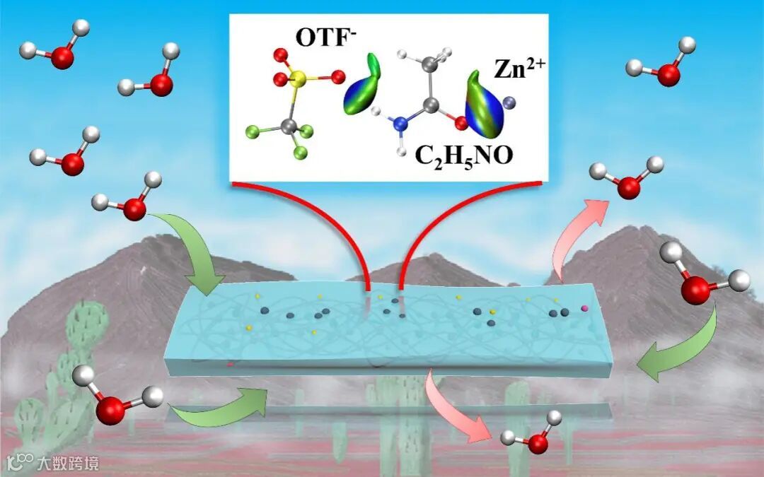 凝胶聚合物电解质组装的柔性锌空气电池有望应用于可穿戴电子设备。然而,低可逆性和短循环寿命阻碍了锌空气电池的产业化进程。由于锌空气电池的半开放结构,热力学不稳定的凝胶聚合物电解质中的水分不可避免地持续蒸发从而导致离子电导率、电池能量输出和寿命急剧下降。同时,失水引起的盐结晶严重破坏了反应界面和空气通道以及凝胶聚合物电解质的力学性能。