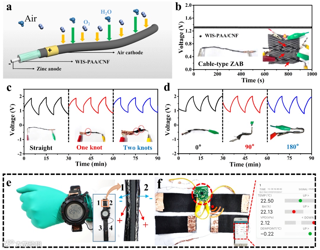 考虑到对人体的运动和柔性织物的复合,可穿戴电源设备必须在变形下可靠工作。如图5所示,基于WIS-PAA/CNF电解质组装的一维“电缆型”和二维“三明治型”锌空气电池在打结和弯曲的形变下依然保持稳定的充放电性能。此外,我们还发现电解质和电极牢固地粘合在一起没有剥离,这说明了电池的良好机械稳定性。所制备的电池可以为发光二极管、数字手表和电子温湿度计供电。