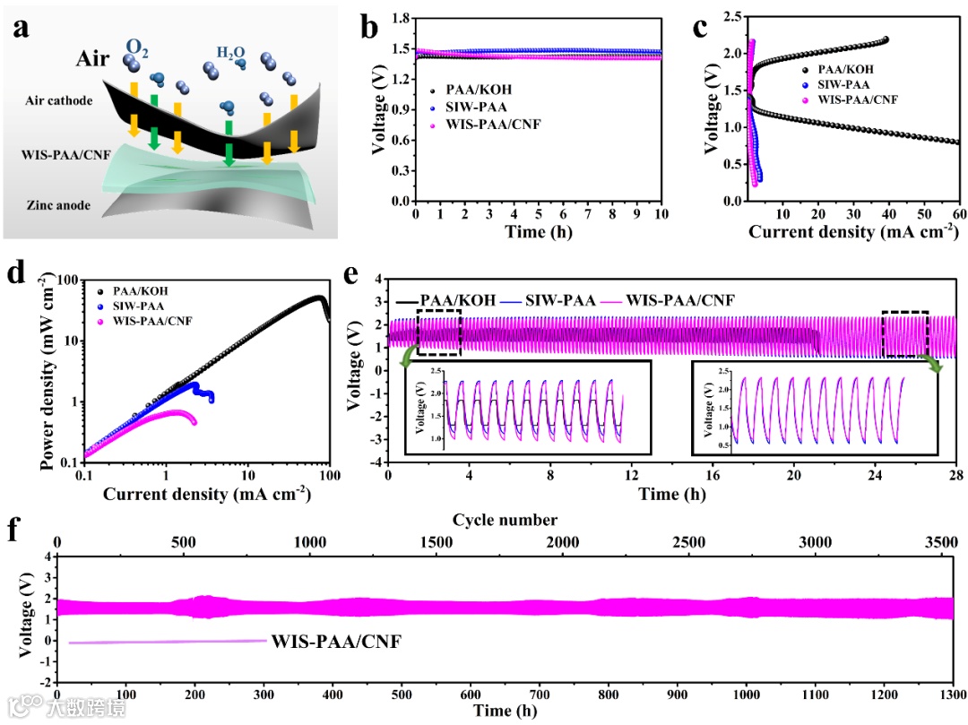图4. 基于WIS-PAA/CNF电解质的锌空气电池性能