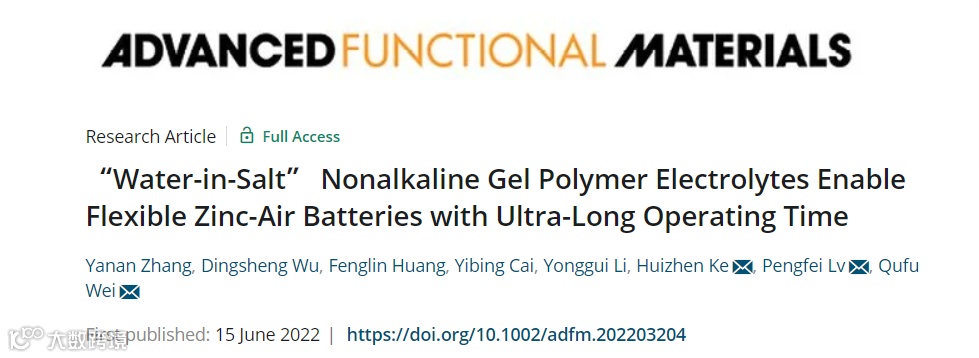 近日,江南大学的魏取福教授与吕鹏飞研究员,闽江学院柯惠珍副教授在国际权威期刊Advanced Functional Materials上发表题为:“Water-in-Salt” Nonalkaline Gel Polymer Electrolytes Enable Flexible Zinc-Air Batteries with Ultra-Long Operating Time的研究文章。该文章提出了一种新型的“盐包水”型非碱性凝胶聚合物电解质(WIS-PAA/CNF),该电解质成功应用于柔性锌空气电池,并实现了1300小时的充放电循环。