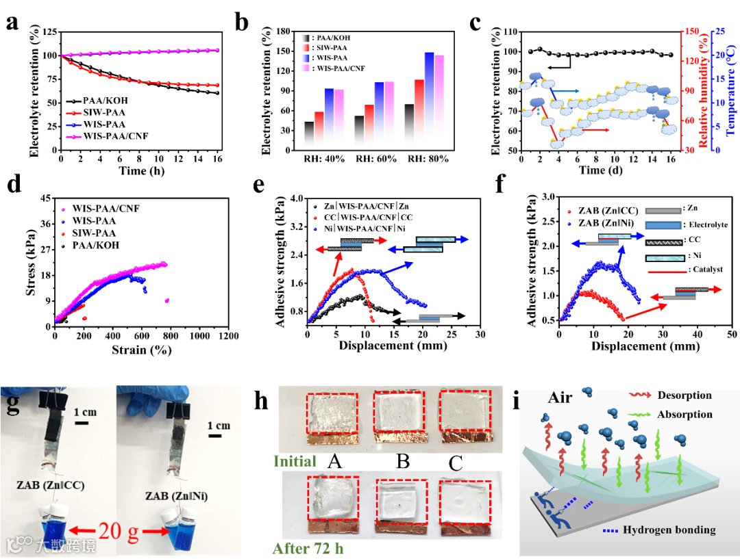 为了维持生命活动,仙人掌通过在高度干旱的沙漠中使用刺来吸收雾作为额外的水源。受此启发,从环境中吸收水分以维持凝胶聚合物电解质的电化学和机械性能是实现柔性锌空气电池长时间运行的新策略。如图1b所示,WIS-PAA/CNF电解质通过电解质溶液中丙烯酸的自由基聚合一步合成。图1c展示了该水凝胶中存在的双网络结构。纤维素纳米纤维的加入可以通过物理缠结和可逆的氢键增强电解质凝胶的强度和拉伸性。