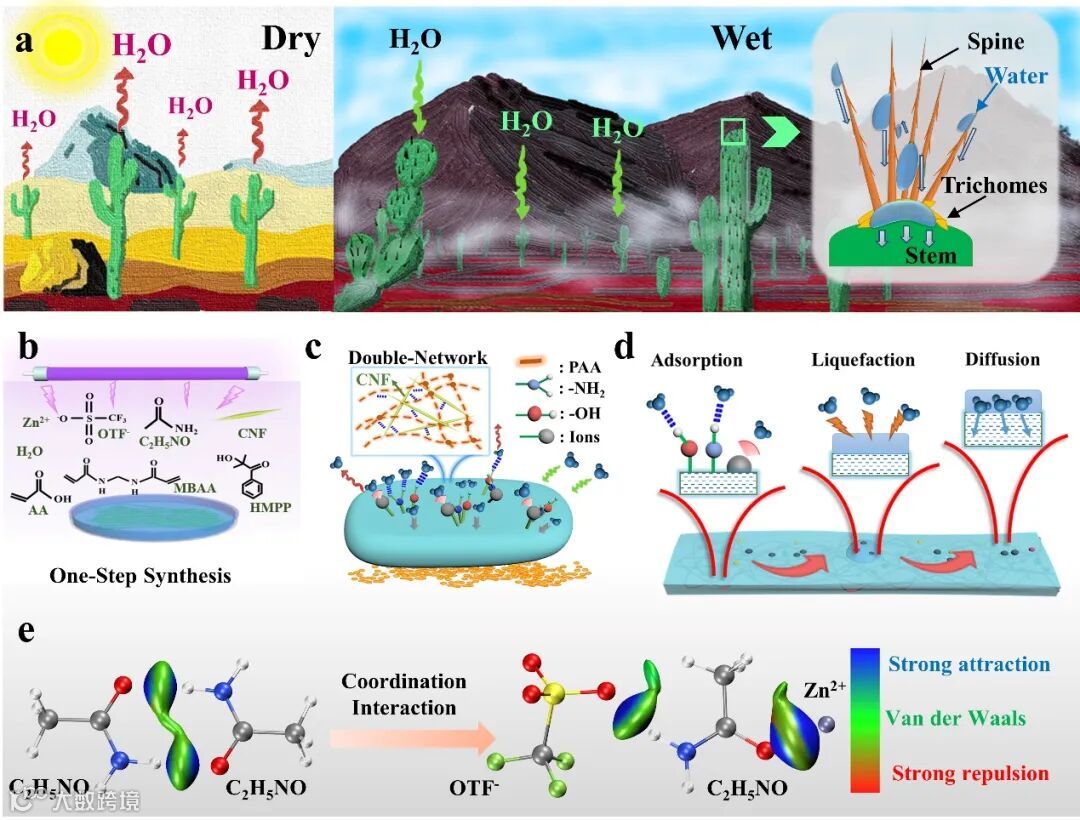 图2. (a)仙人掌集雾机制,(b, c)WIS-PAA/CNF的制备和双网络结构,(d) 电解质吸湿机制,(e)三氟甲基磺酸锌和乙酰胺配位作用。