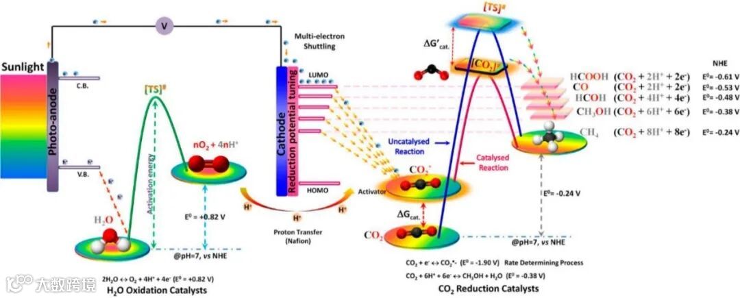 在CO2还原中,由于大多数光电极材料的导带位置低于中间产物CO2•-的氧化还原电位,意味着其进一步转化为其他碳氢燃料在热力学上是难以实现的。然而,这可通过在PEC系统中施加偏压来补偿。电极材料的能级决定了电荷迁移动力学,该动力学由CO2极化、质子浓度和金属催化剂介导的CO2配位控制。同时,通过调控CO2还原路径,可提升CO2还原产物的选择性。