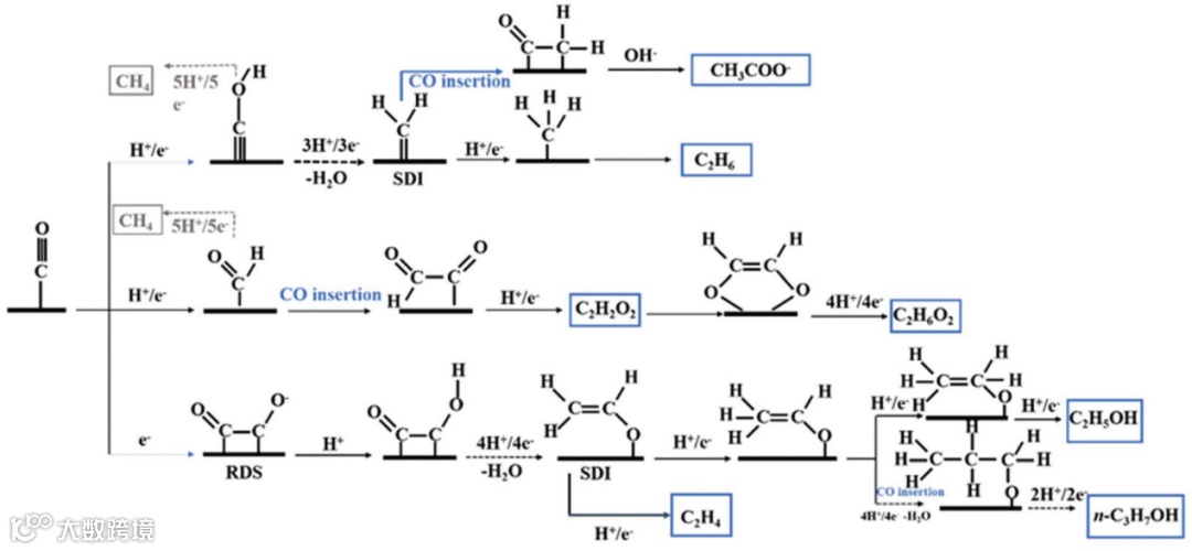 图3. CO2还原生成C2和C3产物路径。(J. Am. Chem. Soc. 2019, 141, 7646.)