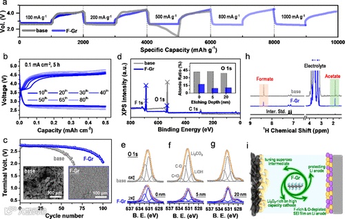 图4、(a)锂-氧气电池倍率性能。(b)-(d)锂-氧气电池循环稳定性及循环后锂金属形貌表征。(d)-(g)循环一定圈数的锂-氧气电池中锂金属表面物种分析。(h)循环一定圈数的锂-氧气电池副产物表征。(i)引入氟化石墨烯实现长稳定循环的锂-氧气电池机理示意图。