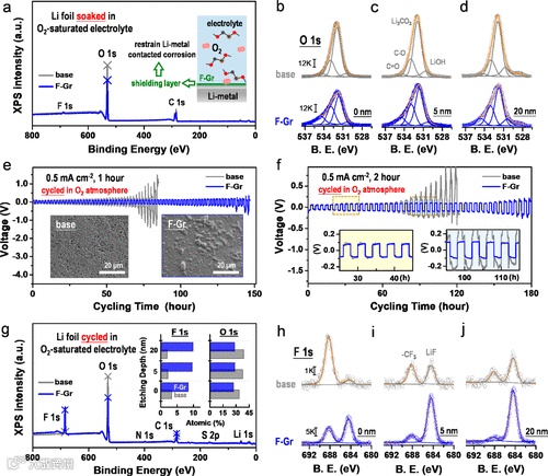 图3、(a)-(d)化学条件下O2环境中锂金属的表面物种分析。(e)-(j)电化学条件下O2环境中锂金属的循环稳定性以及循环后锂金属表面物种分析。