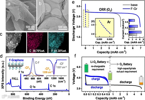图1、(a)-(d)氟化石墨烯的物性表征。(e)锂-氧气电池深度放电曲线。(f)O2条件下引入氟化石墨烯,相继以二次电池和一次电池循环的电压-时间曲线。