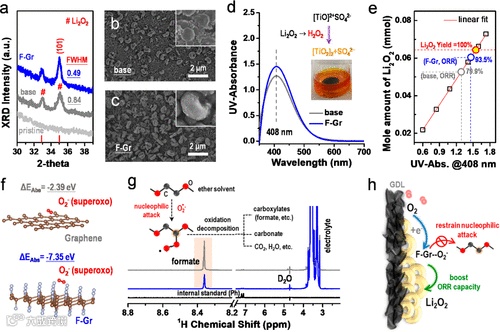 图2、(a)-(c)一定容量下锂-氧气电池放电产物表征。(d)-(e)放电产物产量测定。(f)吸附能计算。(g)放电副产物表征。(h)引入氟化石墨烯影响氧还原反应的机理示意图。