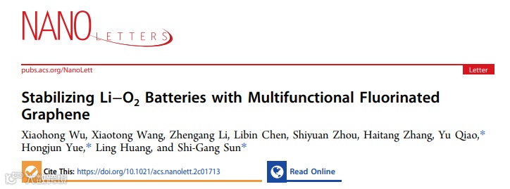 本文中,来自厦门大学的乔羽教授、孙世刚教授与中科院福建物质结构研究所的岳红军教授合作,在国际知名期刊Nano Letters上发表题为“Stabilizing Li−O2 Batteries with Multifunctional Fluorinated Graphene”的研究文章。该文章通过引入氟化石墨烯,加速了中间产物超氧根离子向放电产物Li2O2的转化,有效抑制了相关副反应以及复杂条件下锂金属的腐蚀,从工程学和科学角度上实现了长期稳定循环的锂-氧气电池。