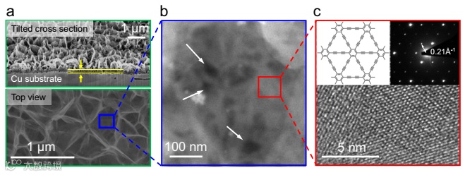 基于石墨炔的纳米多孔膜是通过六乙炔基苯分子的偶联反应合成,从形态上可分为两部分(图1)。一部分为厚度约90nm的准二维平坦层,主要由平面堆叠的纳米级多层石墨炔微晶组成;在该层顶部,石墨炔微晶主要垂直生长并自组织成支架。