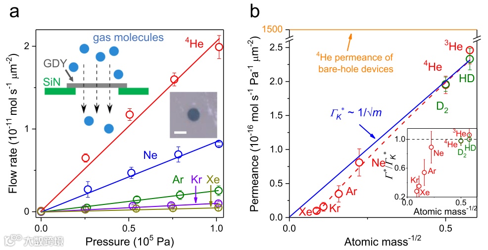 作者利用质谱仪在室温下测量了各种气体(3He、4He、Ne、Ar、Kr和Xe;D2和HD)的渗透性(图2a)。对于分子量小的气体(3He、4He、Ne、D2和HD)而言,气体渗透行为可用Knudsen模型来描述,通量与气体质量的负二分之一次方呈正比;且气体渗透速率极快,较其他准二维薄膜其通量提高了一至两个数量级。