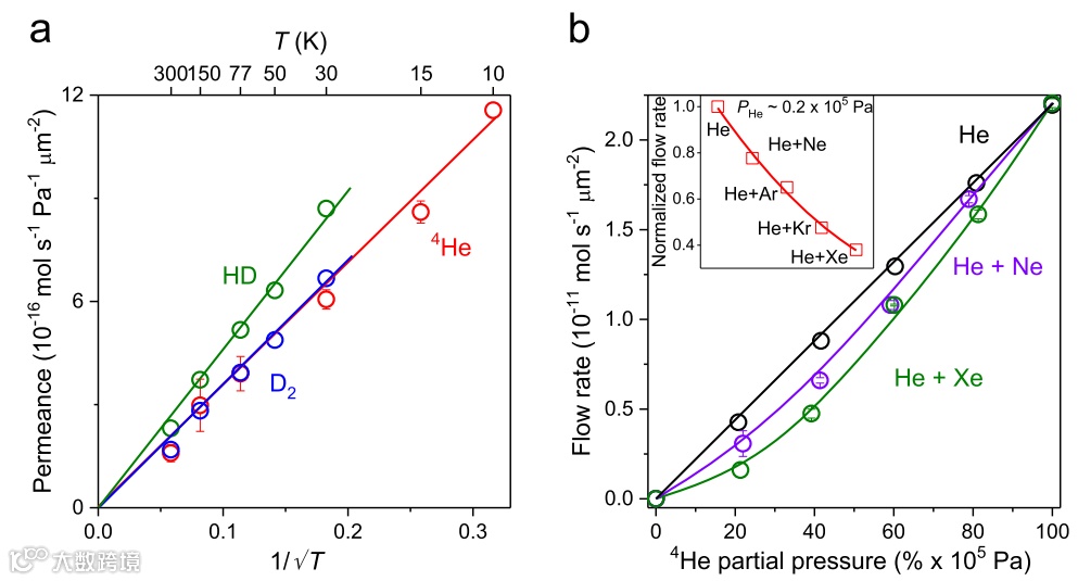 为了进一步揭示机理,作者以不同比例将4He与较重的惰性气体(Ne、Ar、Kr和Xe)混合并测量气体传输通量。结果表明,混合物中4He的流量与其分压之间表现出高度的非线性依赖关系,较重惰性气体的存在抑制了4He的渗透(图3b)。